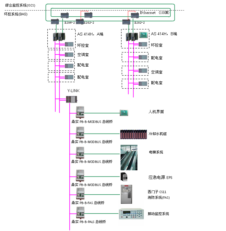 BAS子系统PROFIBUS网络结构采用冗余双环网,即使双环网上出现两处故障点,系统仍然能够正常工作。系统利用Y-LINK设备将双总线结构转换为单总线以实现对单总线接口设备联接的。