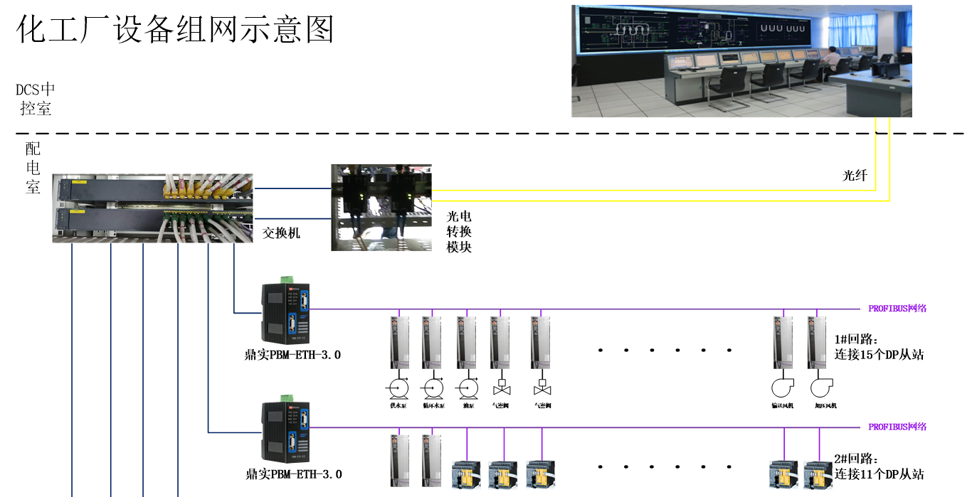 上图所示为山东某化工厂中炭黑生产某环节中设备连接示意图。现场有大量的阀门、水泵、油泵、风机、升降机等设备,有的通过变频器驱动,有的通过电机保护器进行控制、监测、保护、管理。变频器以丹佛斯品牌为主,电机保护器用的是西门子SIMOCODE pro(电机管理和控制设备)系列产品,接口都为PROFIBUS DP(从站)。本例中一个配电室大约有90台设备,控制6条回路,每条回路有10-20DP从站。为了方便维护和管理,每个回路用一个PBM-ETH-3.0模块(PROFIBUS DP主站)。PBM-ETH-3.0模块在以太网侧做MODBUS TCP服务器,连接交换机、光电转换器,通过光纤接入远处的霍尼韦尔DCS中控室,实现现场设备到DCS的连接。
