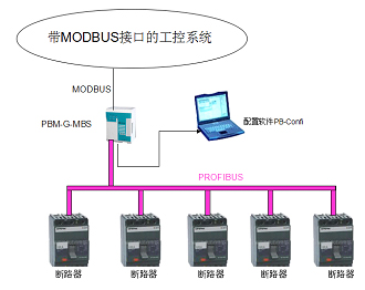 在此系统中,Siemens断路器将其数据(电压、功率、频率等等)通过PROFIBUS-DP传输到主站网关PBM-G-MBS中,然后控制系统通过MODBUS接口从主站网关处获得断路器的数据;同理控制系统也要通过MODBUS接口主站网关发送数据向断路器发出指令。