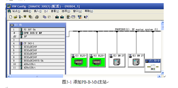 然后选中PROFIBUS(1)DP master system总线,变成黑色,再将硬件目录中的PB-B-MM/V33添加至PROFIBUS-DP 主站系统。对于PLC-1,将PROFIBUS从站地址设为7 ,PLC-2从站地址设为3。DP从站的地址必须与现场模块设置的地址相一致。以PLC-1为例,见下图3-1所示: