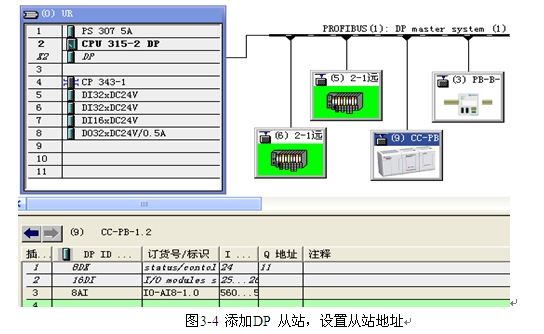 然后选中PROFIBUS(1)DP master system总线,变成黑色,再将硬件目录中的CC-PB-1.2 添加至PROFIBUS-DP 主站系统。在对话框中,将PROFIBUS从站地址设为7 (此处的DP从站的地址7必须与CC-PB-1.0设置的地址相一致)。见下图3-4所示: