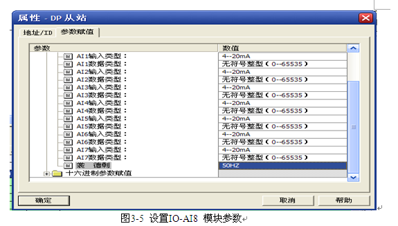 为扩展I/O模块设置通信地址0,AI0-AI8输入类型选择4-20mA,数据类型选择无符号整型(0-65535),采样频率50HZ。见下图3-5。
