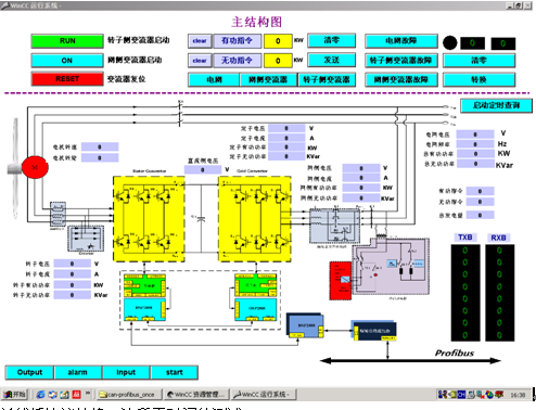 用WINCC编写的界面上可以看出有启动和停止,发送指令以及一些变流器工作参数显示等。在右下角的两条显示区域分别是总线桥发送和接收两个寄存器的值。