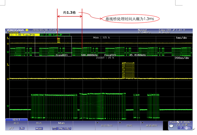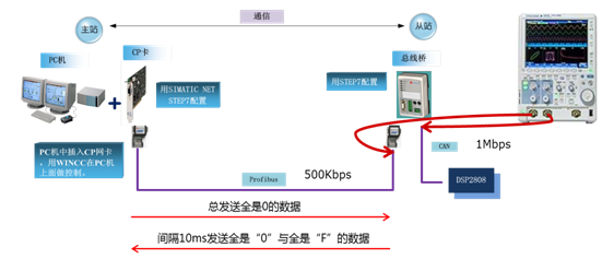 测试方法:测量从示波器测到CAN信号开始到Profibus侧信号出来的时间间隔,就是总线桥处理数据,进行协议转换的时间。