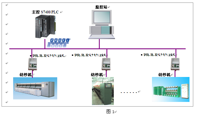 系统采用PROFIBUS现场总线,PLC SIEMENSE S7400 PLC,通过PB-B-RS232/485与各种纺纱机通讯接口连接。
