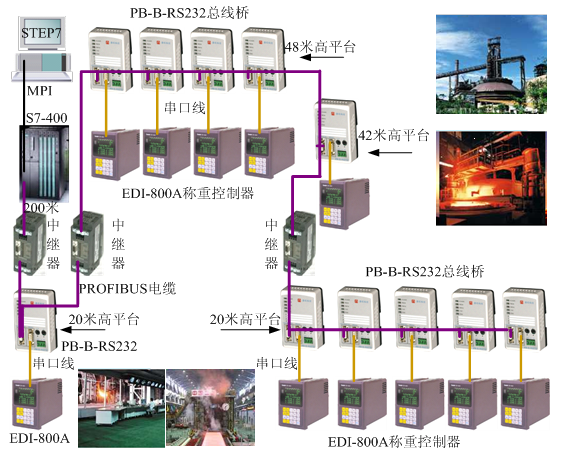 EDI-800A下面连接的设备是脱碳炉和脱磷炉散装系统中的称量斗,主要将脱磷和脱碳过程中的重量数据及时地反馈给主站。