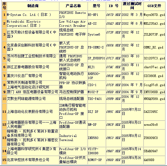 2002-2005 年度已通过“中国 PROFIBUS 产品测试实验室”测试的产品公告如下: