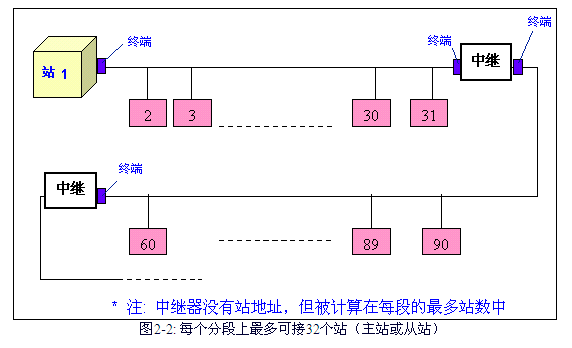 (4) 当分段站超过32个时,必须使用中继器用以连接各总线段。串联的中继器一般不超过3个。见图2-3所示: