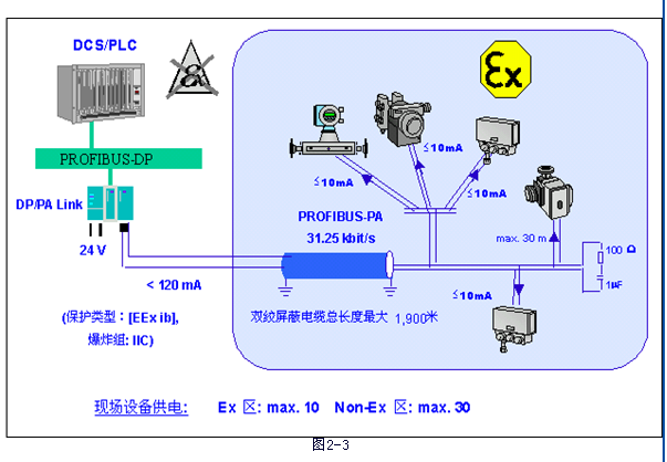 (1) 数据IEC1158-2的传输技术用于PROFIBUS-PA,能满足化工和石油化工业的要求。它可保持其本征安全性,并通过总线对现场设备供电。
