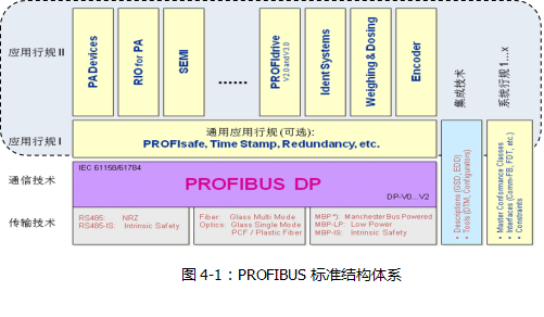 “设备行规“或称”产品行规“,在PROFIBUS/PROFINET标准体系中就是“应用行规II“,见图4-1:PROFIBUS标准结构体系。设备行规详细规定各种不同设备在PROFIBUS/PROFINET网络中的功能属性.这些不同种类设备如:驱动器类(变频器、伺服器)、编码器、PA流程控制类设备(温度、压力、流量传感器、执行器)、称重器类等等。为实现同类型、不同厂家产品设备互换提供技术设计标准。设备行规代表了此类设备在国际市场上的主流技术标准。