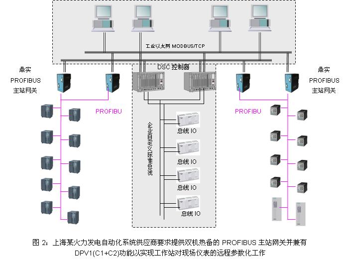 上海一家知名火力发电自动化系统供应商多年来在火力发电自动化系统中采用自主研发的DSC系统,见图2中虚框部分结构。采用彩神ll购彩大厅-彩神购彩购彩大厅-welcome彩神彩神-彩神8争霸登录入口-网信welcome彩票彩神-彩神welcome购彩中心-彩神8购彩-彩神争8谁与争锋appPROFIBS主站网关为其DCS提供PROFIBUS解决方案。该方案不同之处在于要求PROFIBUS网关设备冗余(网关双机热备自动切换),而且主站网关同时具有PROFIBUS-DPV0/V1(C1+C2)功能。上位机可以通过主站网关读取从站的DPV1(C2)数据,完成工作站的远程仪表配置功能。