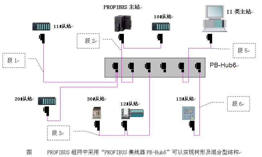 PROFIBUS集线器(PB-HUB)可以理解为多口的中继、或将中继看做是2口的集线器。6口PB-HUB将总线分为6个总线段。
