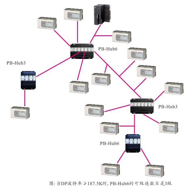 PB-Hub3/6的每个接口相当于一个中继器接口,可以独立驱动一个PROFIBUS段。即:可以再连接最多31个站接口,在187.5K以下波特率可延长传输距离到1公里。PB-Hub3/6还可以实现级连。这样,通过PB-Hub3/6组成的混合型PROFIBUS网络结构,站点数可达126站点。传输距离根据级连个数可以到达3~4公里(与选用的DP波特率有关)。