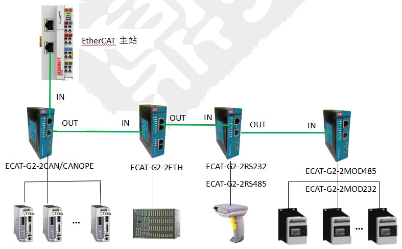 主站模式,可以接入多台modbus从站设备到EtherCAT,比如变频器、综保、马保、二次仪表、软启、传感器、流量计等,具体可以连接的设备数量受EtherCAT数据量以及modbus配置指令条数限制。