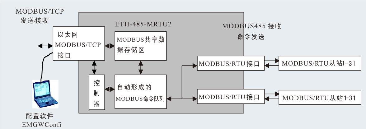 ● 区别于透明传输模式,本网关是存储器共享式网关,具有数据刷新速度快,客户机编程简单的优点。通过配置软件EMGWConfi组态每个MODBUS/RTU与MODBUS/TCP存储区(0区、1区、3区、4区)的映射关系并下载配置,网关自动形成MODBUS/RTU报文定时循环发送,以太网一侧客户机只要通过MODBUS/TCP读/写网关存储区即可实现对MODBUS/RTU的监控。如下图所示: